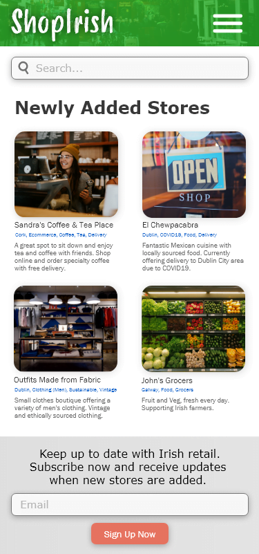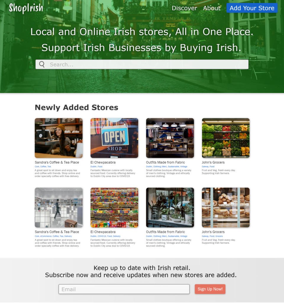 When looking for local brands to shop with & support, I found it hard to browse for companies through Google, social media, or other channels. I wished there was a central repository where I could explore the various Irish companies selling their products online.